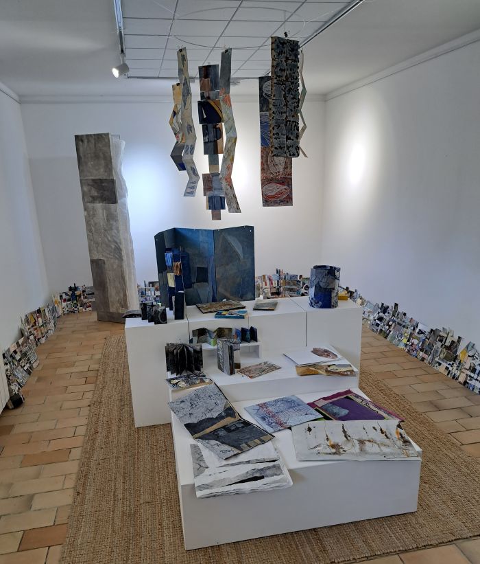 Je travaille essentiellement avec le papier. J’aime sa souplesse, sa fragilité, sa générosité. J’expérimente toutes les sortes de papier, du plus épais, voire du carton, au plus humble, par exemple le papier de soie des boîtes à chaussures. J’utilise également des détails de mes peintures, gravures, dessins, monotypes, ou bien je les déchire et les recycle. Je manipule, j’assemble, je superpose, j’efface. Je retravaille toute cette matière avec des encres, des craies, de l’acrylique.